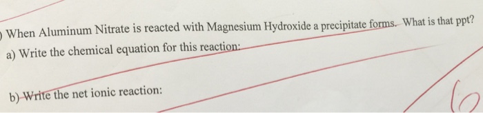Write the net ionic equation for each of the following reactions. List all spectator ions. 7. A solution of aluminum bromide, AlBr 3 reacts with a solution of sodium hydroxide, NaOH to form the precipitate aluminum hydroxide, Al(OH) 3. 8. Aqueous copper (II) nitrate, Cu(NO 3) 2 reacts with ... Access Content